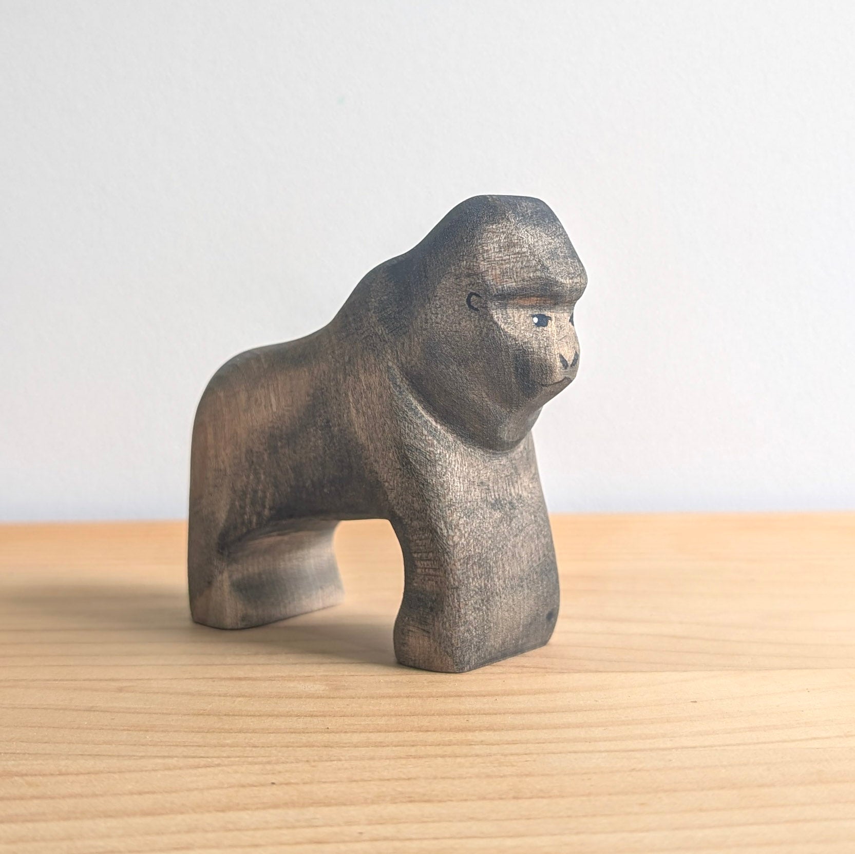 Hand-carved from sustainably sourced maple and finished in non-toxic paint, this silverback gorilla is a broad, powerful, deeply satisfying thing to hold. Every muscular shoulder, prominent brow, and trademark silver-streaked back has been shaped by hand, giving this piece a gravitas that sets it apart on any shelf. At a sturdy medium size, it's built for the kind of bold, imaginative play that does justice to one of nature's most awe-inspiring animals.